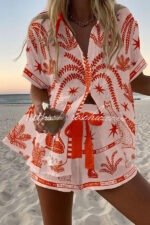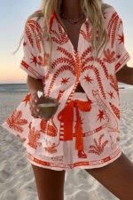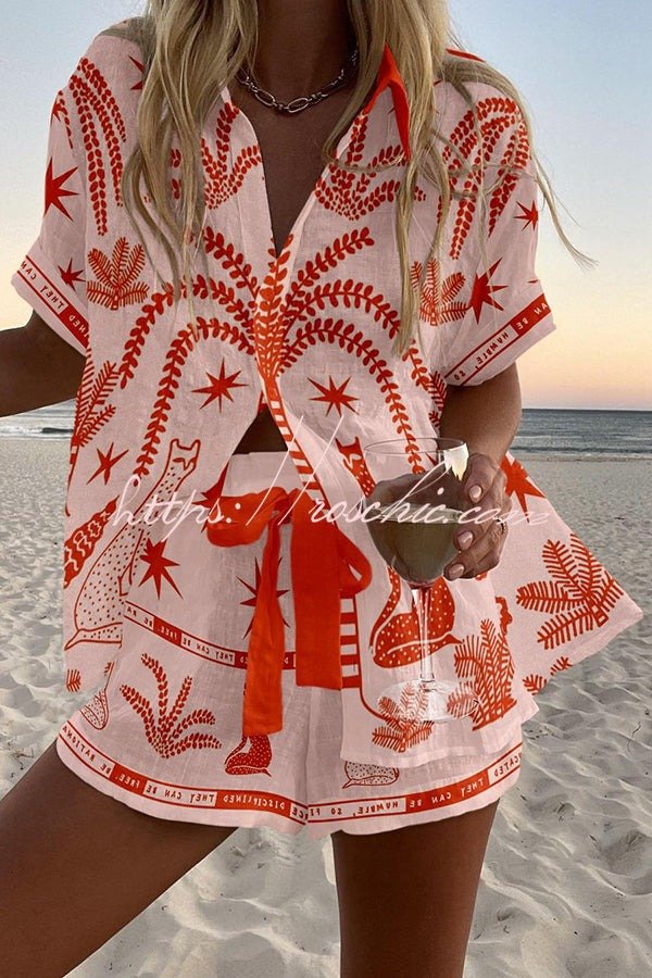 Exotic Fish Print Loose Button Elastic Waist Shorts Set