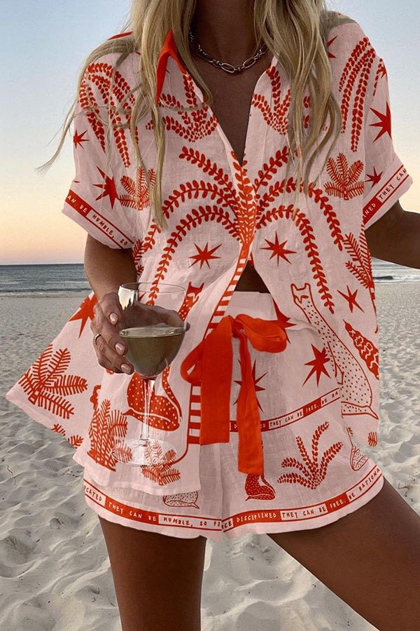 Plant Cat Print Loose Button Elastic Waist Shorts Set