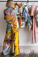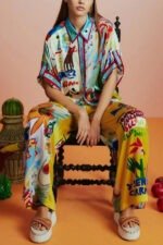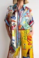 Raina Satin Unique Print Short-sleeved Loose Shirt and Elastic Waist Pocket Pants Set