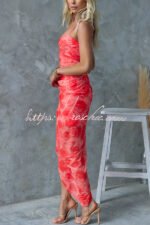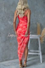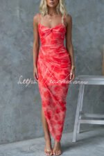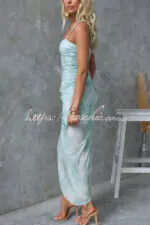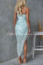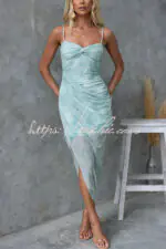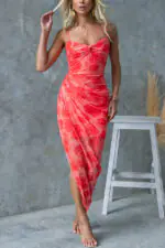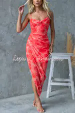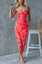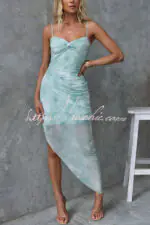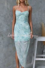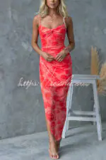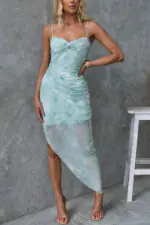 Saloni Mesh Floral Print Twist Ruched Detail Irregular Hem Stretch Maxi Dress