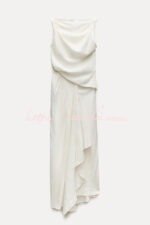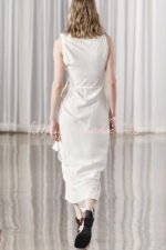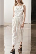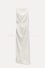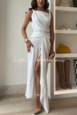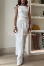 Sculptural Effect Linen Blend Twisted Shoulder Strap Drape Maxi Dress