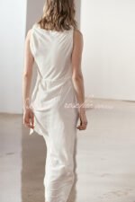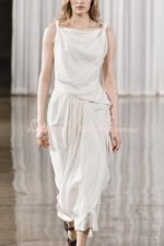 - This dress made of a spun linen blend adds to the trend of garments that use draped fabric and layers to create a sculptured effect. The tailored silhouette with a crossed detail on the body and an asymmetric cut make this design a singular garment.