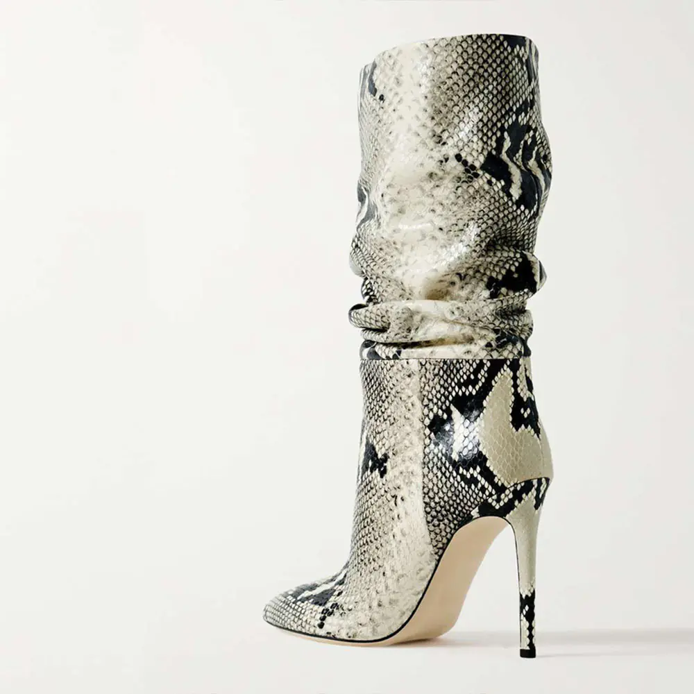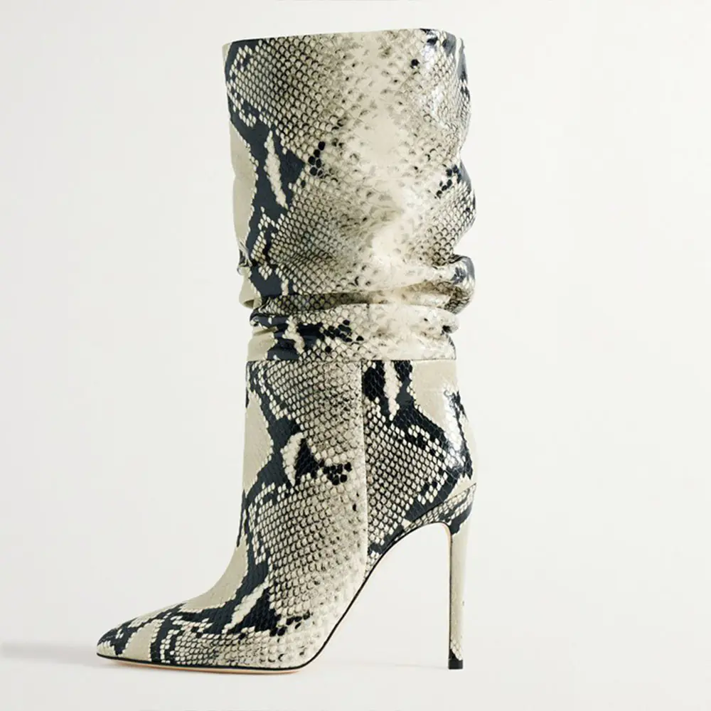 Sexy Grey Pointed Toe Snake Embossed Stiletto Slouch Boots