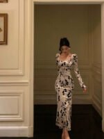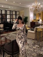 Sexy Sheath Black Floral Velvet Long Sleeves Prom Dresses Birthday Outfits SD310
