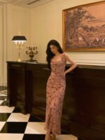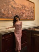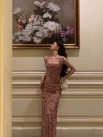 Sexy Sheath Square Neckline Floral Pink Prom Dresses Birthday Outfits Evening Gown SD1025