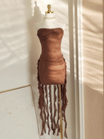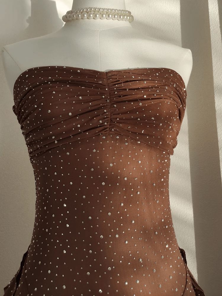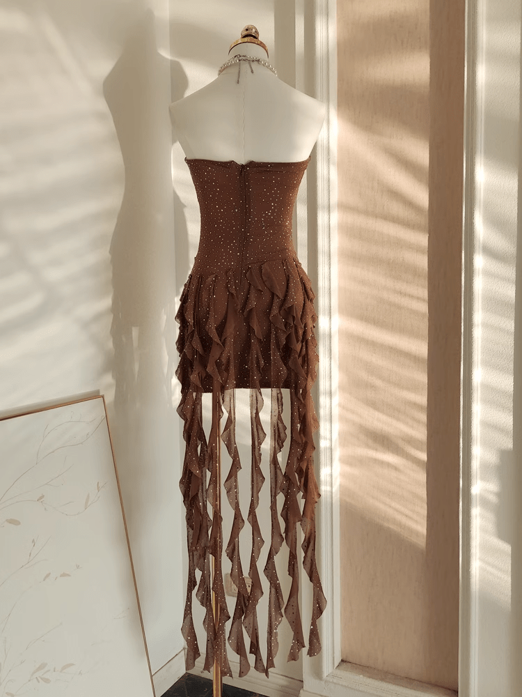 Sexy Sheath Strapless Ruffles Tulle Brown Vacation Dresses Short Birthday Outfits SD345