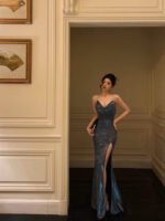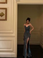 Sexy Sheath Straps Sequin Blue Slit Long Prom Dresses Evening Dress SD420