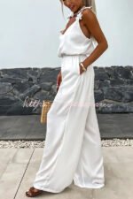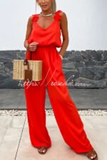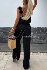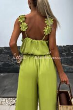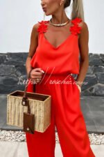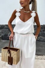Solid Color Embroidered Flower Suspenders Casual Loose Jumpsuit