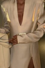 Solid Color Glossy V-neck Long Sleeve Casual Slit Maxi Dress