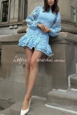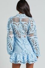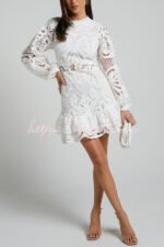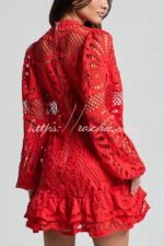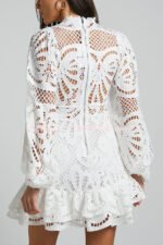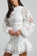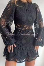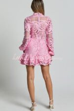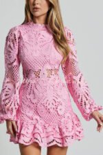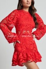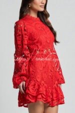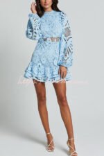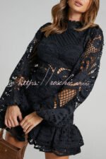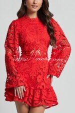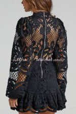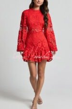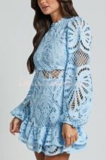 Solid Color Hollow Long-sleeved Waisted Lace Mini Dress