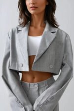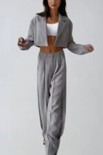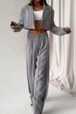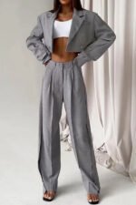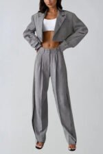 Solid Color Lapel Cropped Blazer and Pocket Straight-leg Pants Set