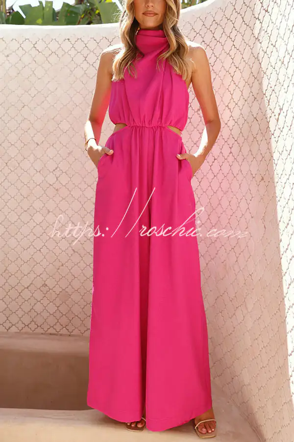 Solid Color Resort Style Halter Neck Waist Pocket Wide Leg Jumpsuit