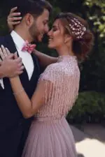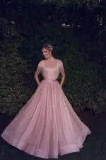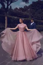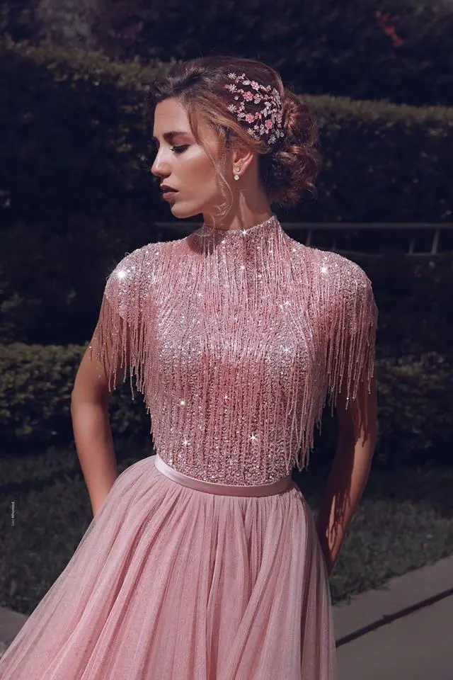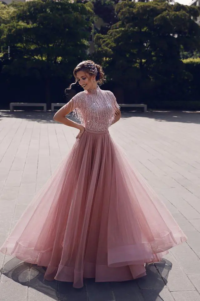 Special High Neck Tassel Beading Cap Sleeves Princess Prom Dresses Blushing Pink Evening Gowns