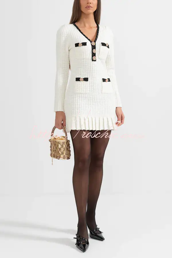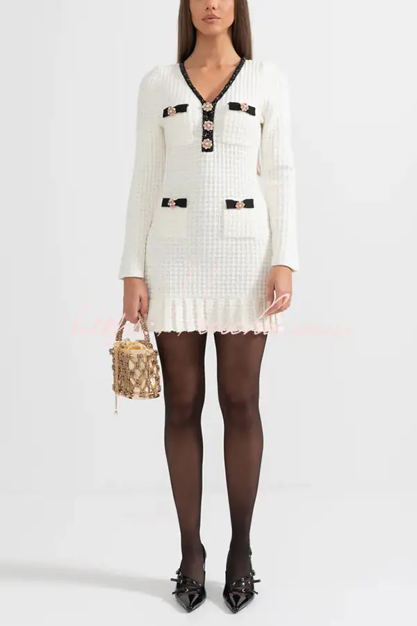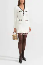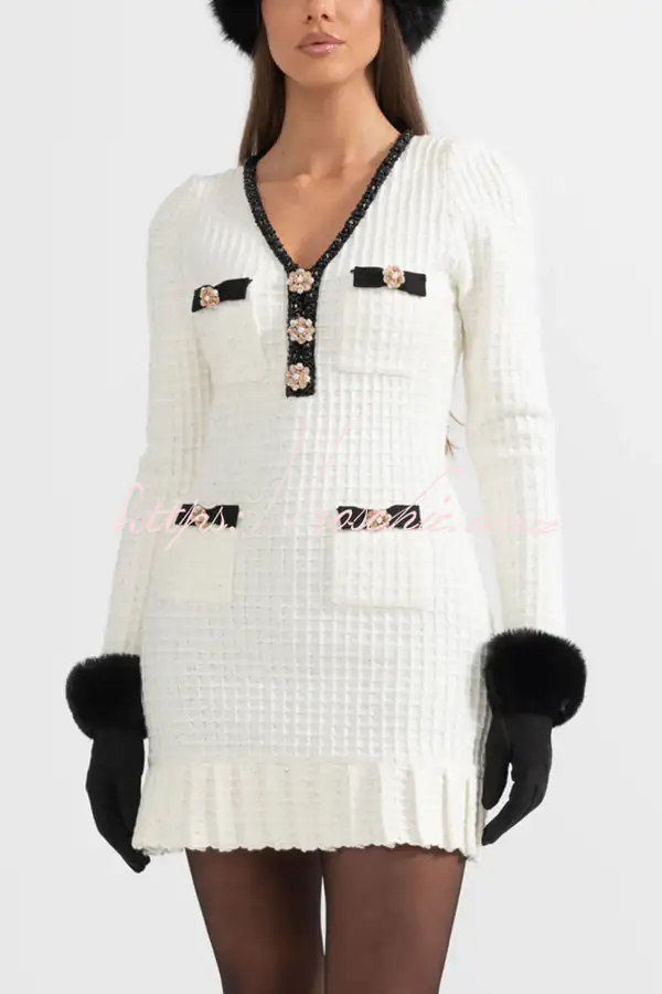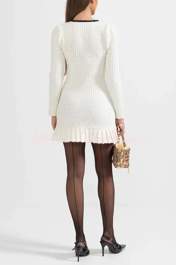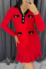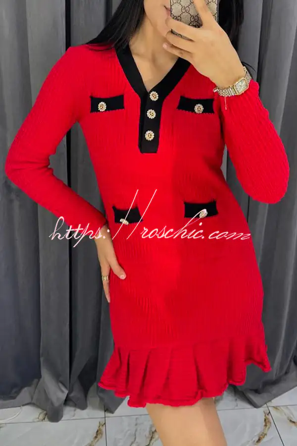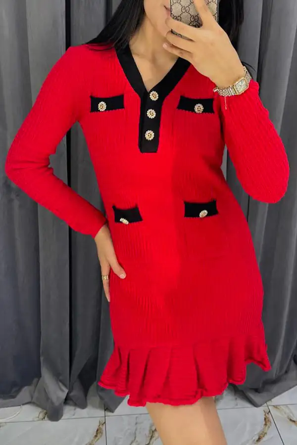 Stylish Waffle Contrast V-neck Ruffled Knitted Mini Dress