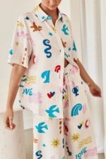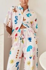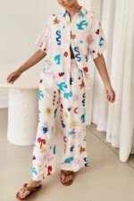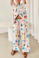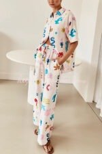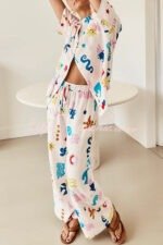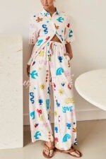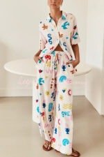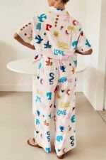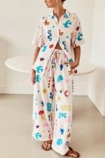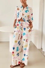 Summer Beach Element Printed Button Lace Up Pocket Pants Suit