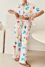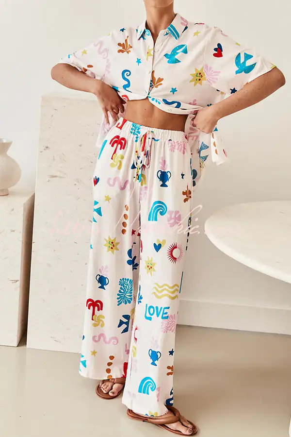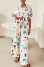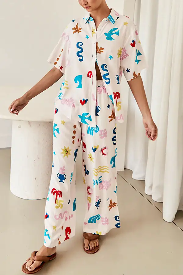 Summer Beach Element Printed Button Lace Up Pocket Pants Suit