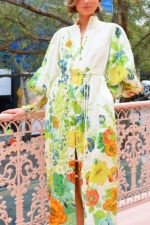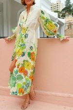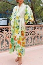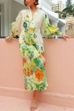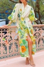 Summer Party Floral Print Balloon Sleeve Pocketed Belt Shirt Midi Dress