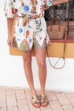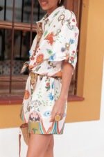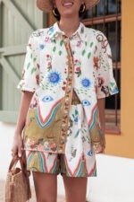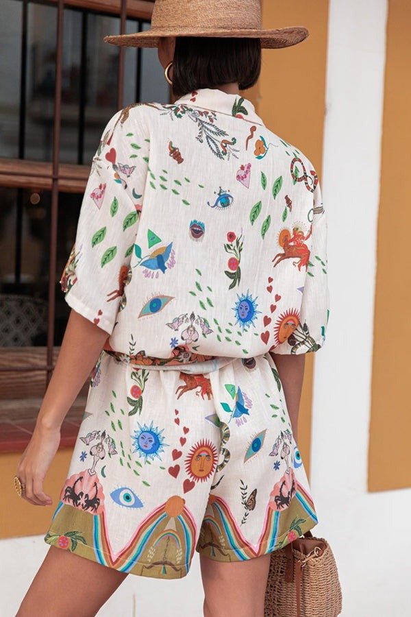 Sun Kiss Linen Blend Unique Print Button Loose Shirt and Elastic Waist Pocket Shorts Set
