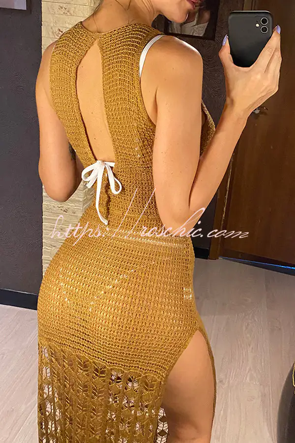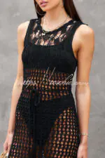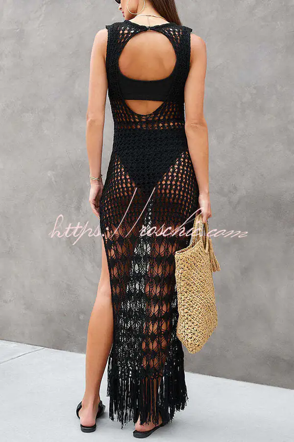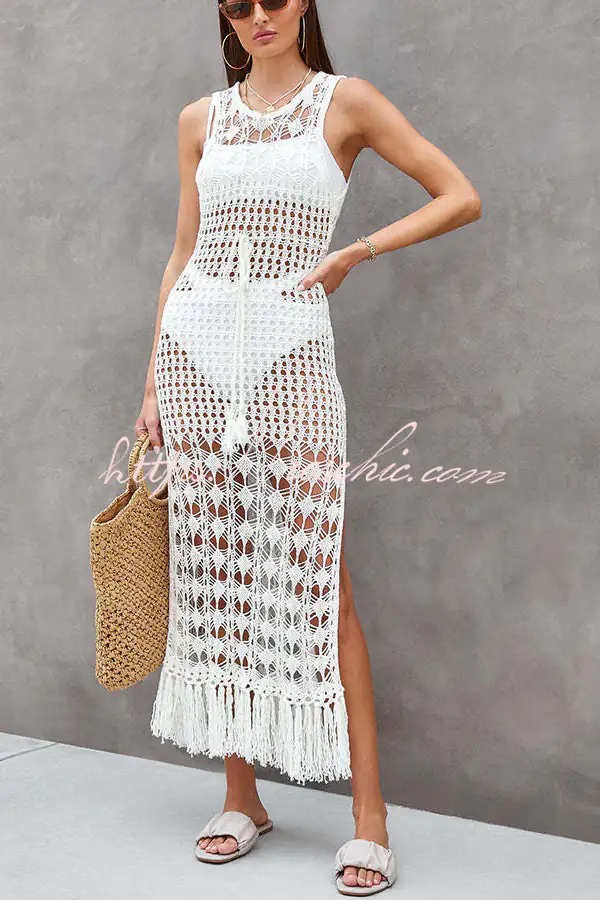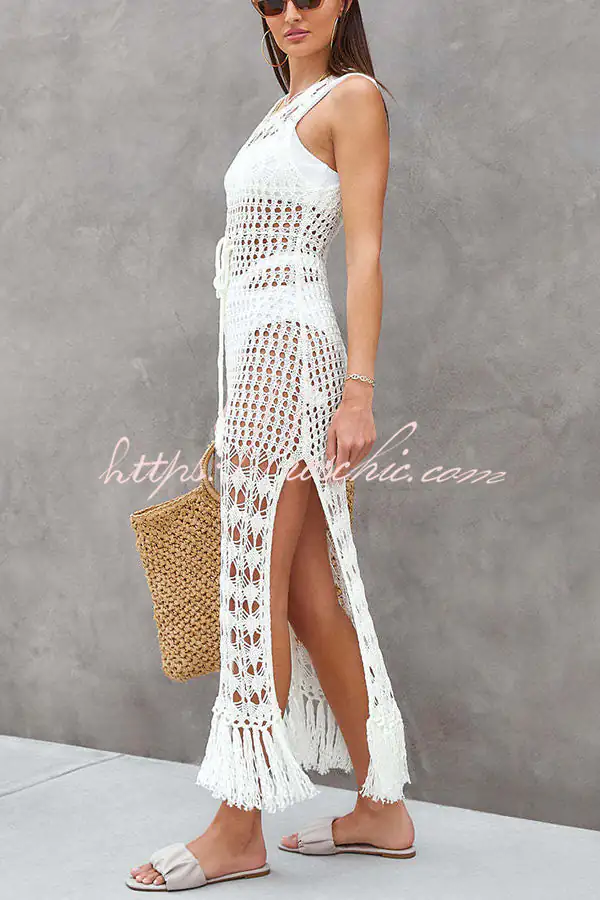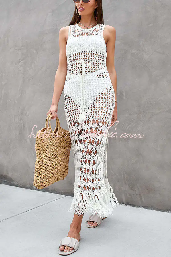 - Our beach dress is ultra chic and perfect for sipping cocktails while watching the sunset after a day at the beach.Featuring a crochet fabric with cut out pattern detail. a scoop neckline. waist tie. maxi lengths and tassel trimming detail – this is one for your new season summer wardrobe.