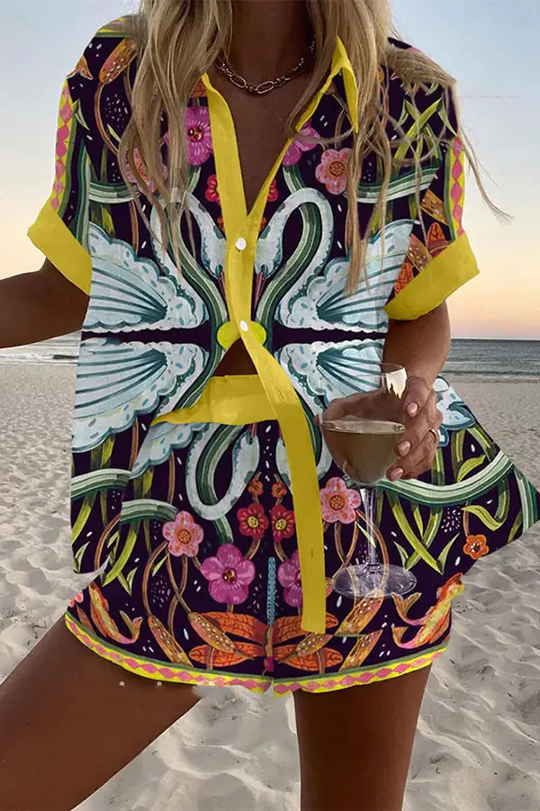 Swan Print Loose Buttoned Elastic Waist Shorts Set