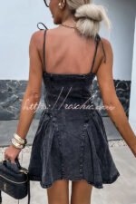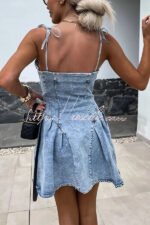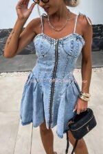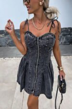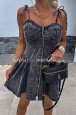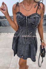 Sweet and Unique Washed Denim Center Front Zipper Stretch Mini Dress