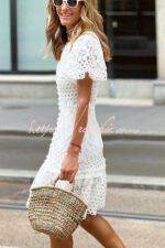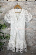 Sweet Valor Crochet Lace Puff Sleeve Button Up Mini Dress