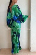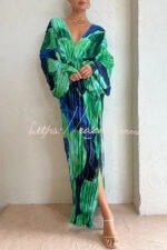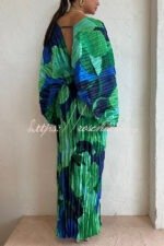 Tropical Oasis Capri Print Kimono Sleeve Pleated Cocoon Maxi Dress