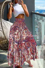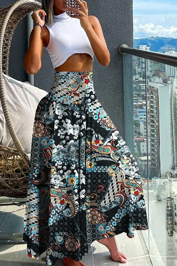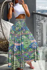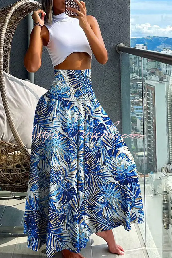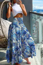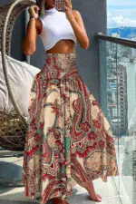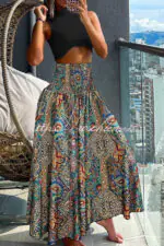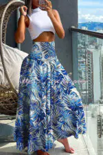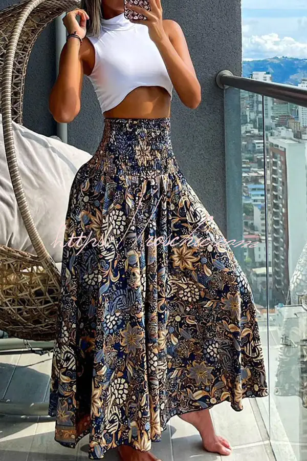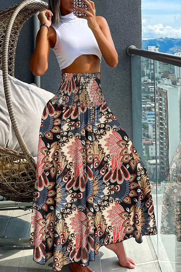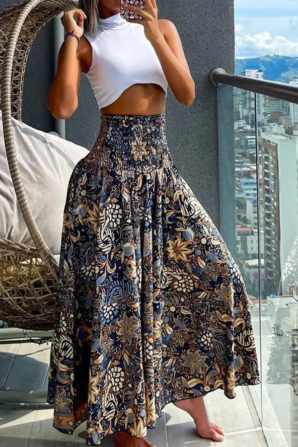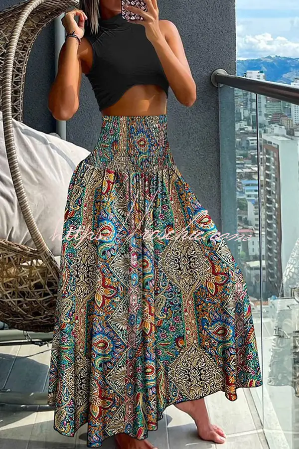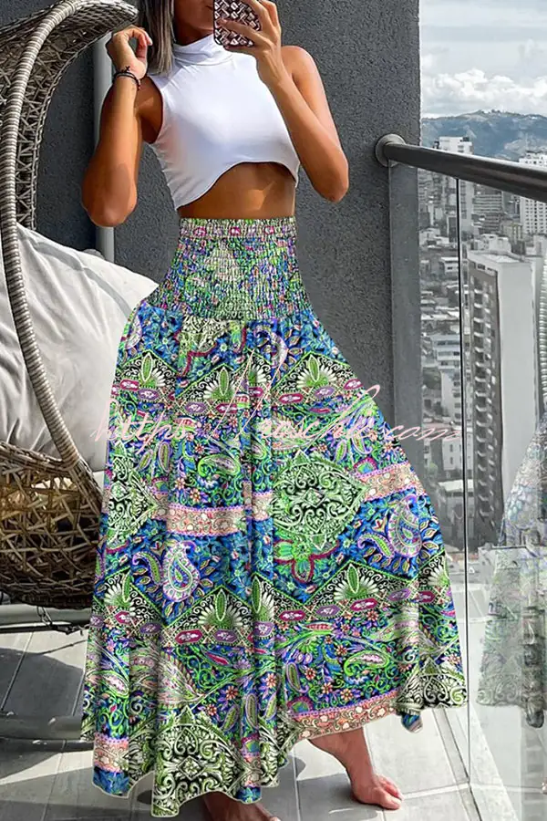 Unique Printed Pleated Elastic Waist Holiday Casual Maxi Skirt