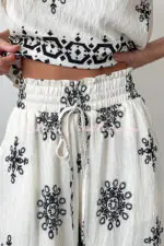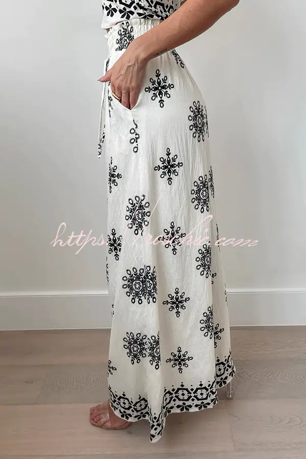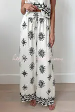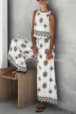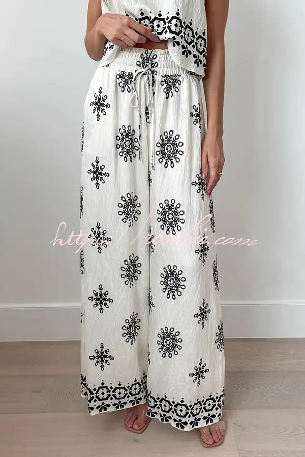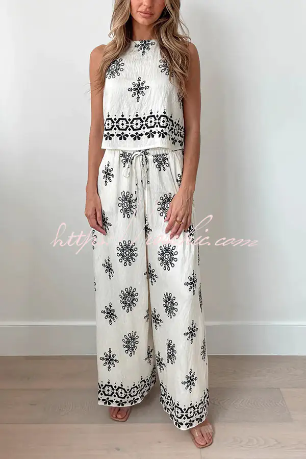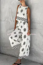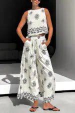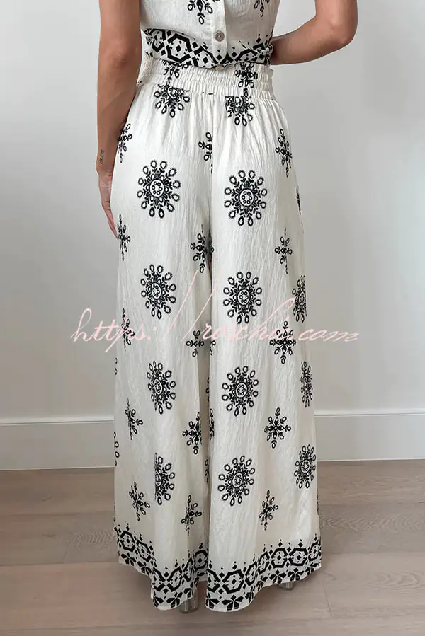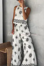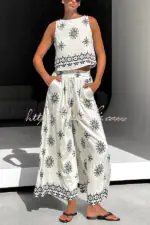 Unique Printed Round Neck Sleeveless Button Top and Elastic Waist Pocket Wide Leg Pants Set