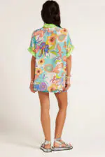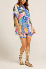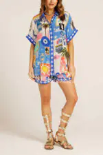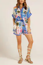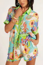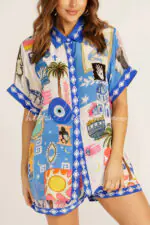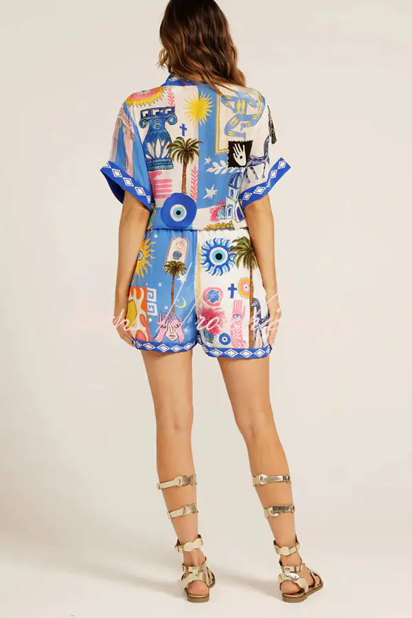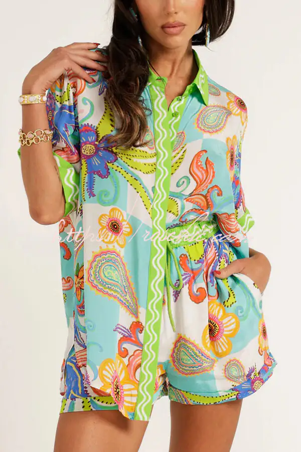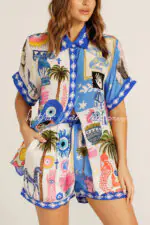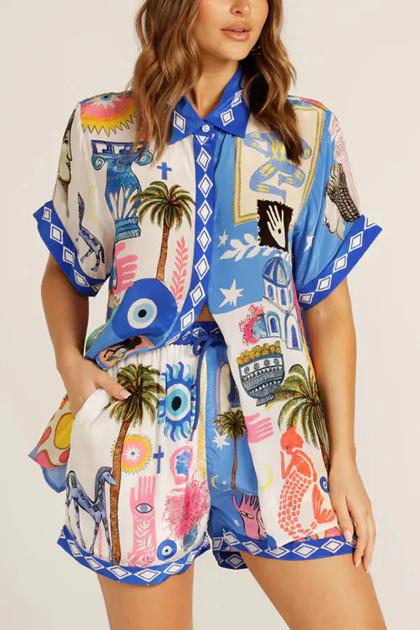 Unique Printed Short-sleeved Casual Loose Shirt and Elastic Waist Drawstring Pocket Shorts Set