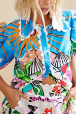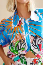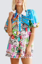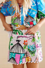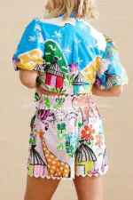 Unique Printed Wave Lace Puff Sleeve Loose Shirt and Elastic Waist Pocket Shorts Set