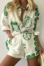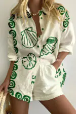 Vacation Green Shell Print Button Elastic Waist Pocket Shorts Set