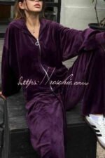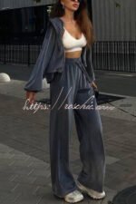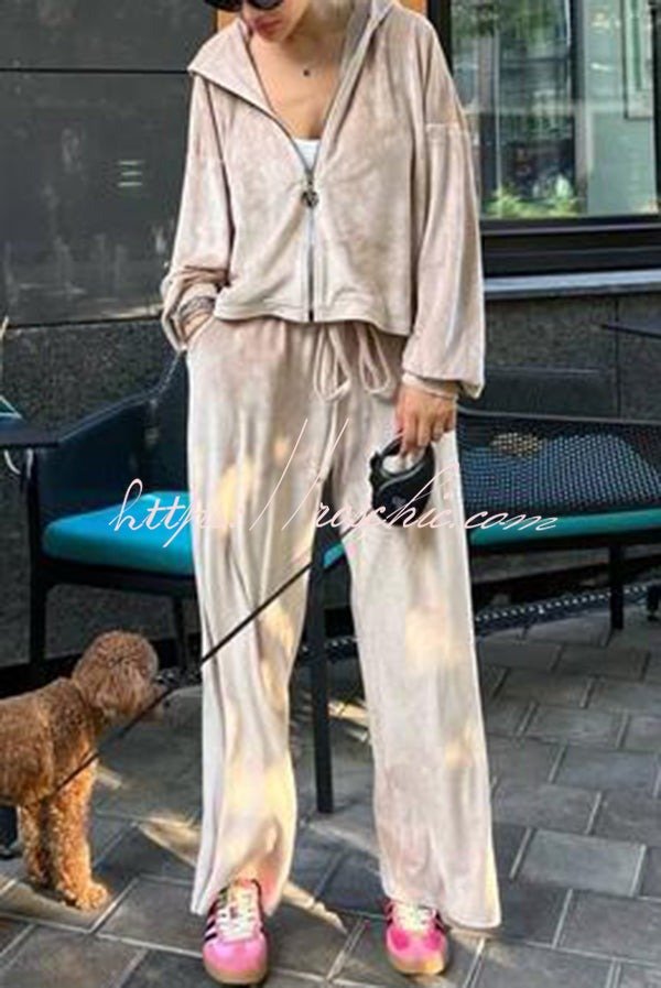 Velvet Casual Zip-up Hooded Top and Elastic Waist Wide Leg Pants Set