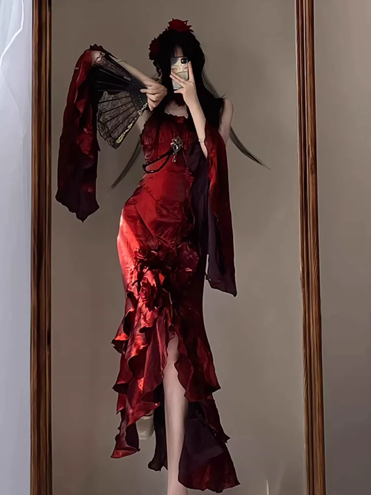 Vintage High Low Irregular Ruffled Spaghetti Straps Women’s Burgundy Birthday Outfits Party Dresses With Sleeves SD441