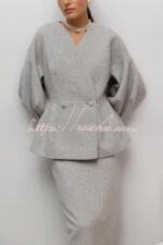 Viseu Texture Fabric Button Balloon Sleeve Coat and Elastic Waist Pencil Maxi Skirt Set