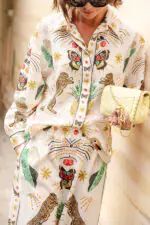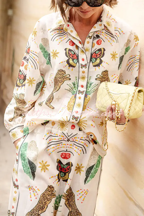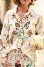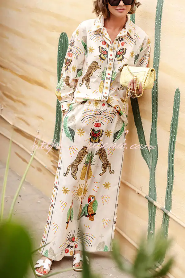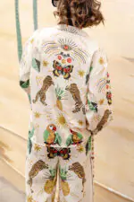 - Step into the wild side with our captivating long-sleeved shirt blouse in ecru. Embrace the exotic with a vibrant print featuring cheetahs. parrots. pineapples. butterflies. and suns. Crafted for the bold and adventurous. this blouse effortlessly blends style and personality. Let your outfit roar with personality. whether you’re out for brunch or exploring the urban jungle.