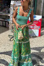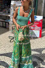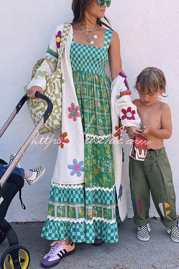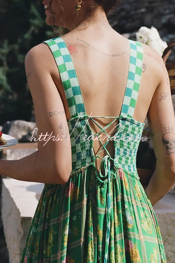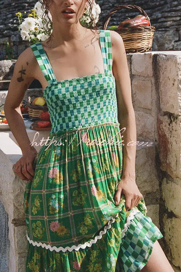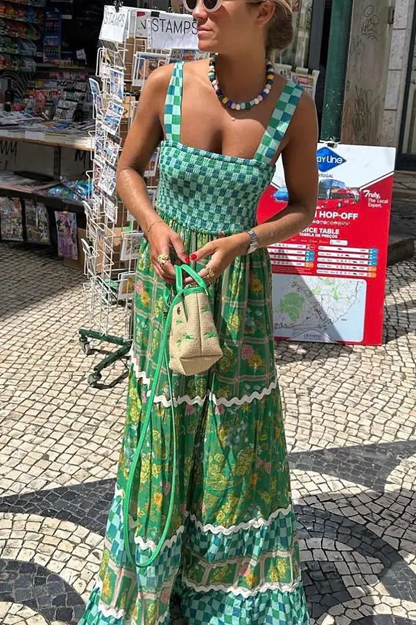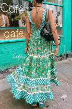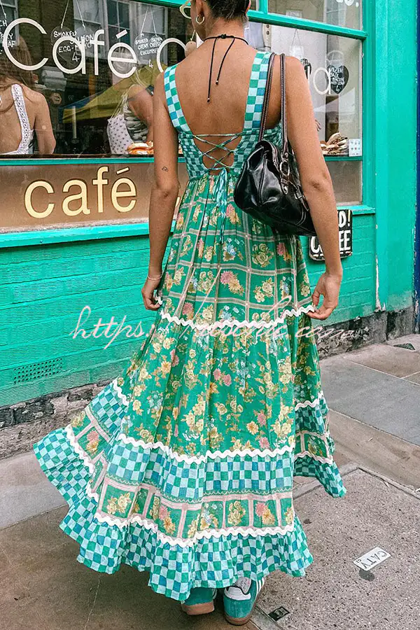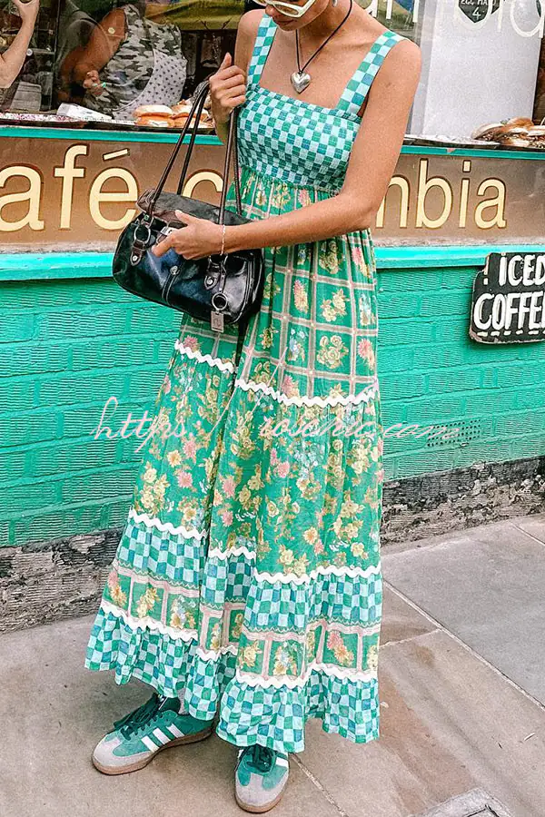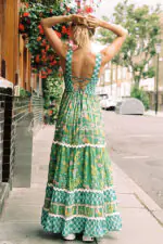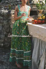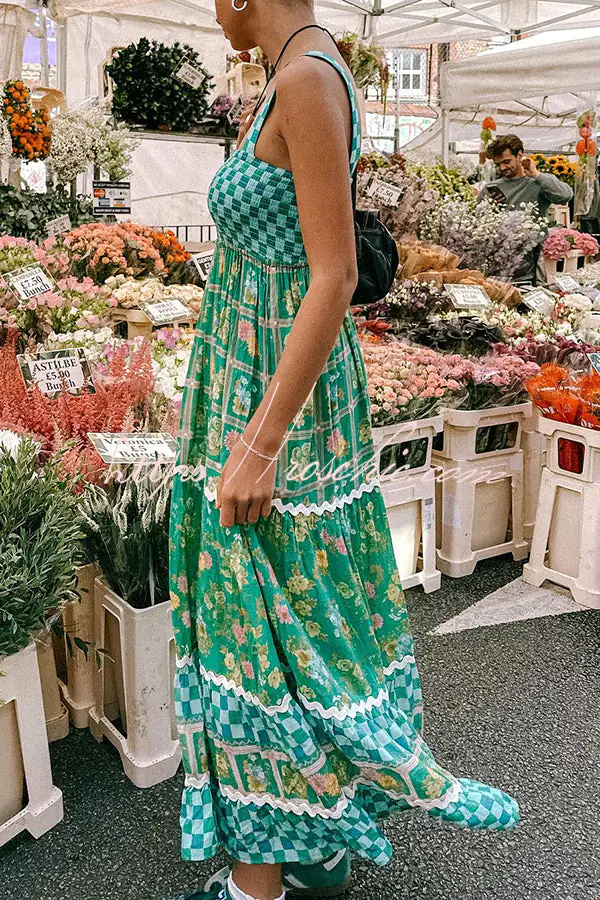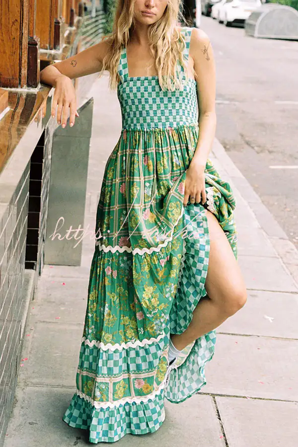 Yolanda Ric Rac Trims Unique Print Smocked Bust Back Lace-up Maxi Dress