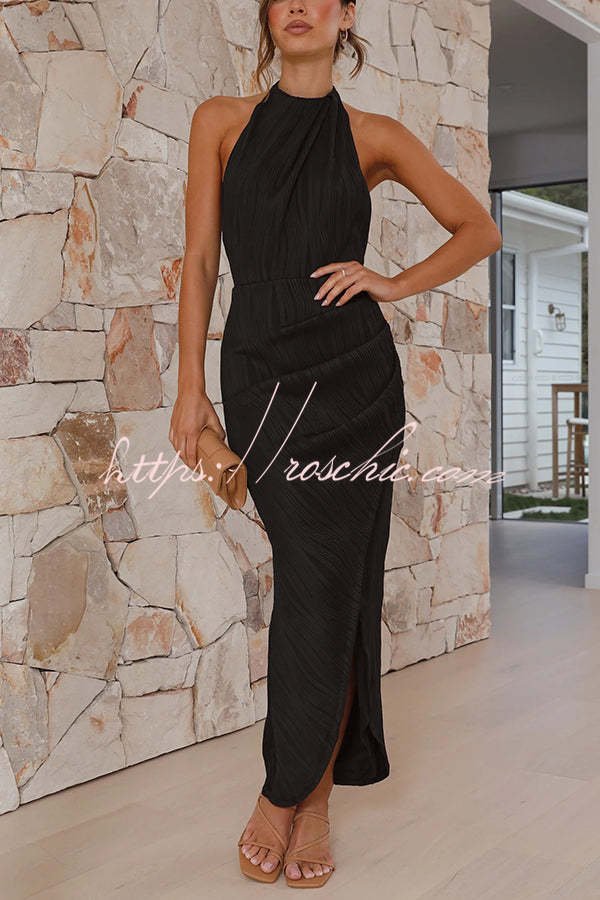 Zephyr Pleated Textured Fabric Halter Neck Backless Slit Maxi Dress